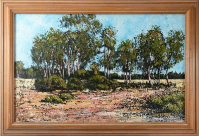 Oil on board. 21 x 40 cm (frame size 33 x 52 cm). Dated 1969. The Macquarie Galleries label on the back.